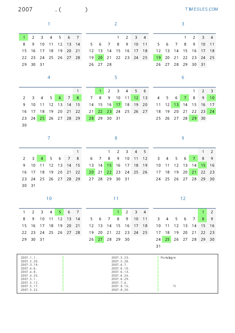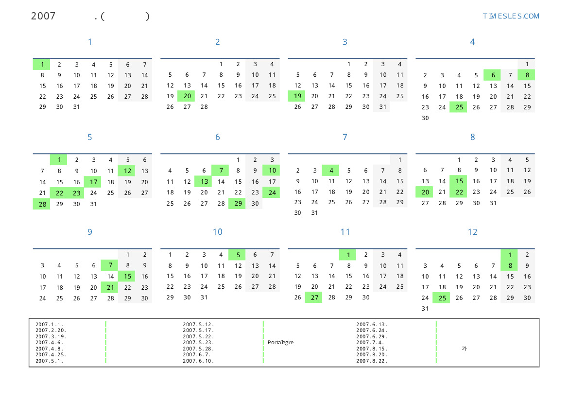 포르투갈 의 2007 년 공휴일 및 주말 달력