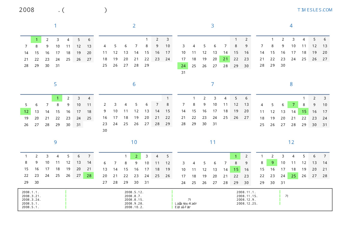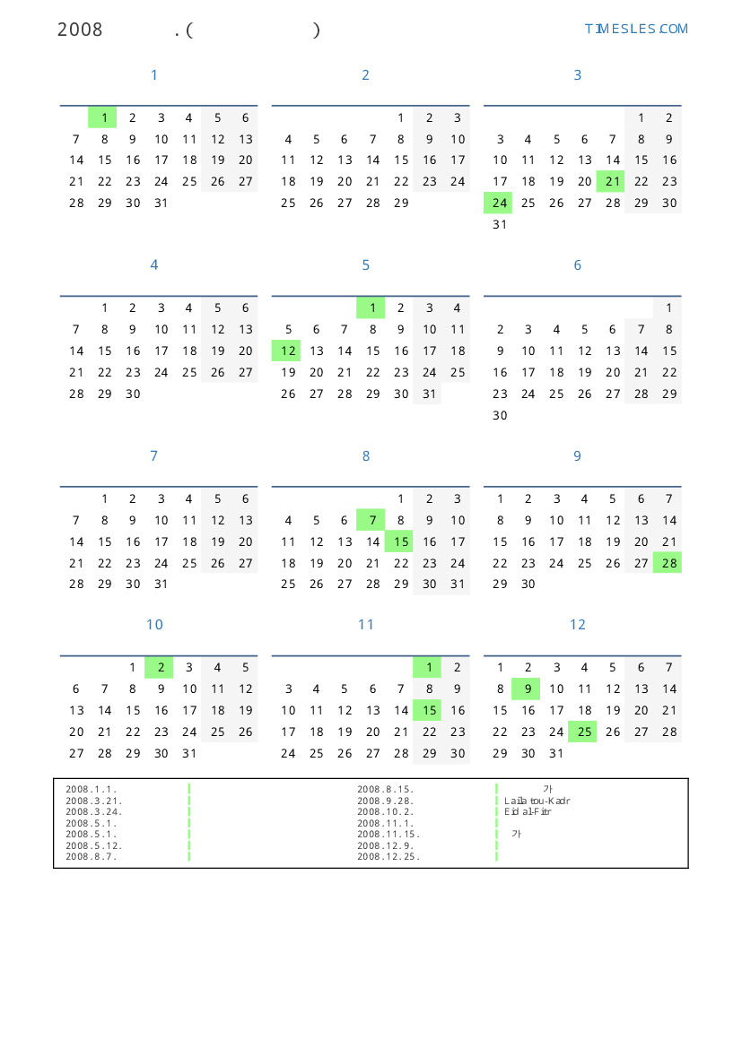 코트 디부 아르 의 2008 년 공휴일 및 주말 달력
