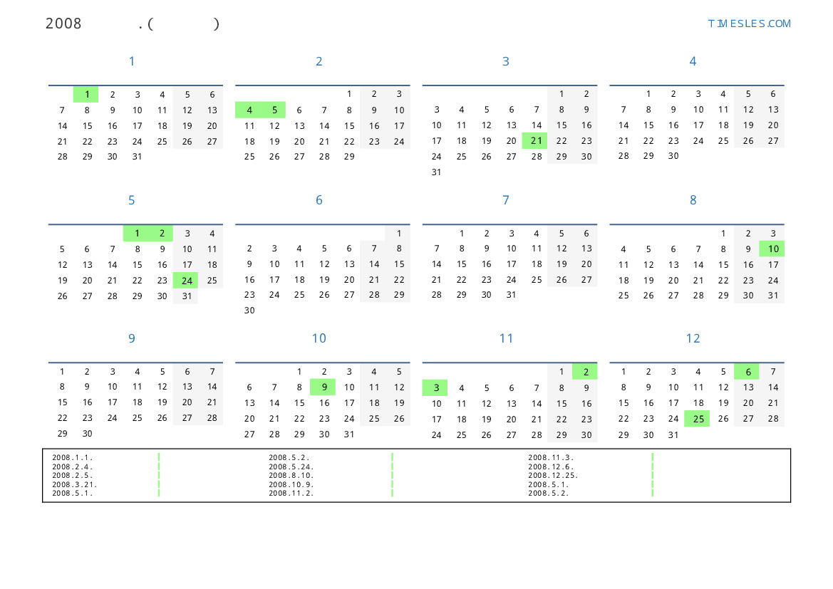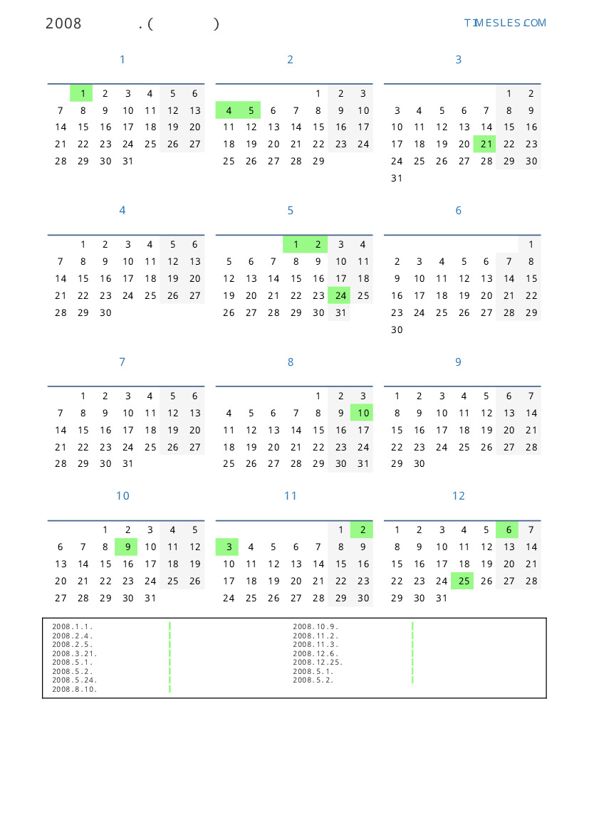 그레고리 안, 윤년, 1 년에 366 일. 2008년 에콰도르 26 공휴일 및 휴무 있습니다. 중국 동부 달력에서 2008 년은 쥐의 해입니다. 연도는 화요일에 시작하여 수요일에 끝납니다.