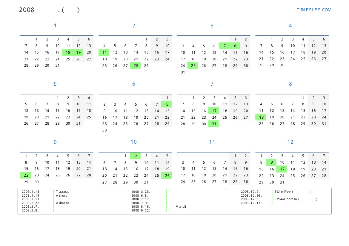 그레고리 안, 윤년, 1 년에 366 일. 2008년 이란 20 공휴일 및 휴무 있습니다. 중국 동부 달력에서 2008 년은 쥐의 해입니다. 연도는 화요일에 시작하여 수요일에 끝납니다.