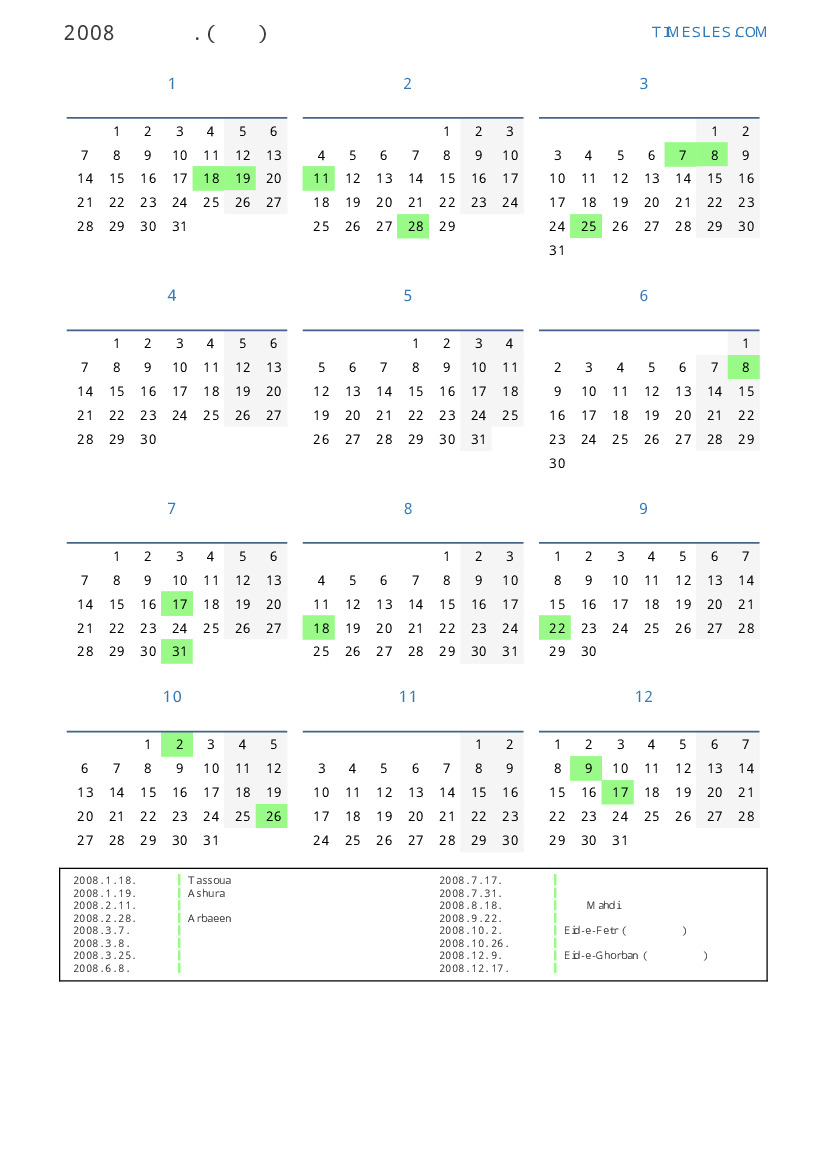 이란 2008 년 공휴일 및 주말이 포함 된 PDF 캘린더 다운로드 및 인쇄