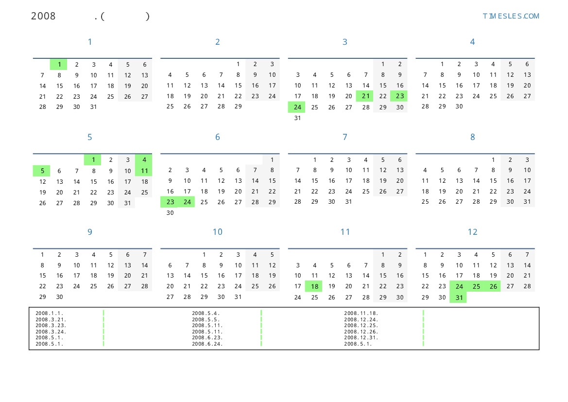 그레고리 안, 윤년, 1 년에 366 일. 2008년 라트비아 28 공휴일 및 휴무 있습니다. 중국 동부 달력에서 2008 년은 쥐의 해입니다. 연도는 화요일에 시작하여 수요일에 끝납니다.