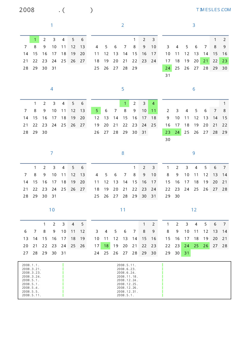 라트비아 2008 년 공휴일 및 주말이 포함 된 PDF 캘린더 다운로드 및 인쇄