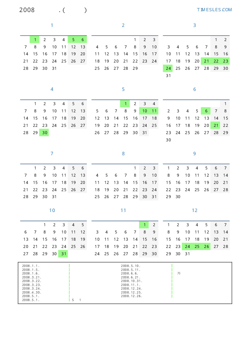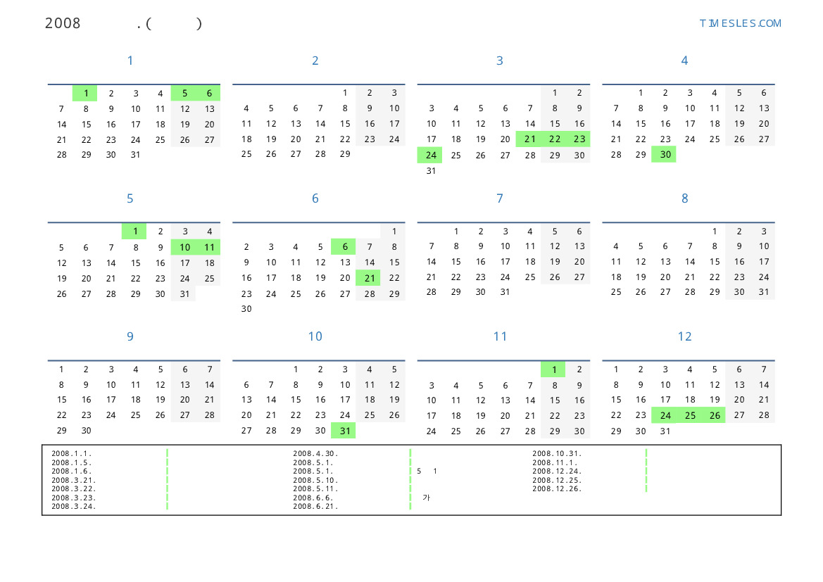그레고리 안, 윤년, 1 년에 366 일. 2008년 스웨덴 34 공휴일 및 휴무 있습니다. 중국 동부 달력에서 2008 년은 쥐의 해입니다. 연도는 화요일에 시작하여 수요일에 끝납니다.