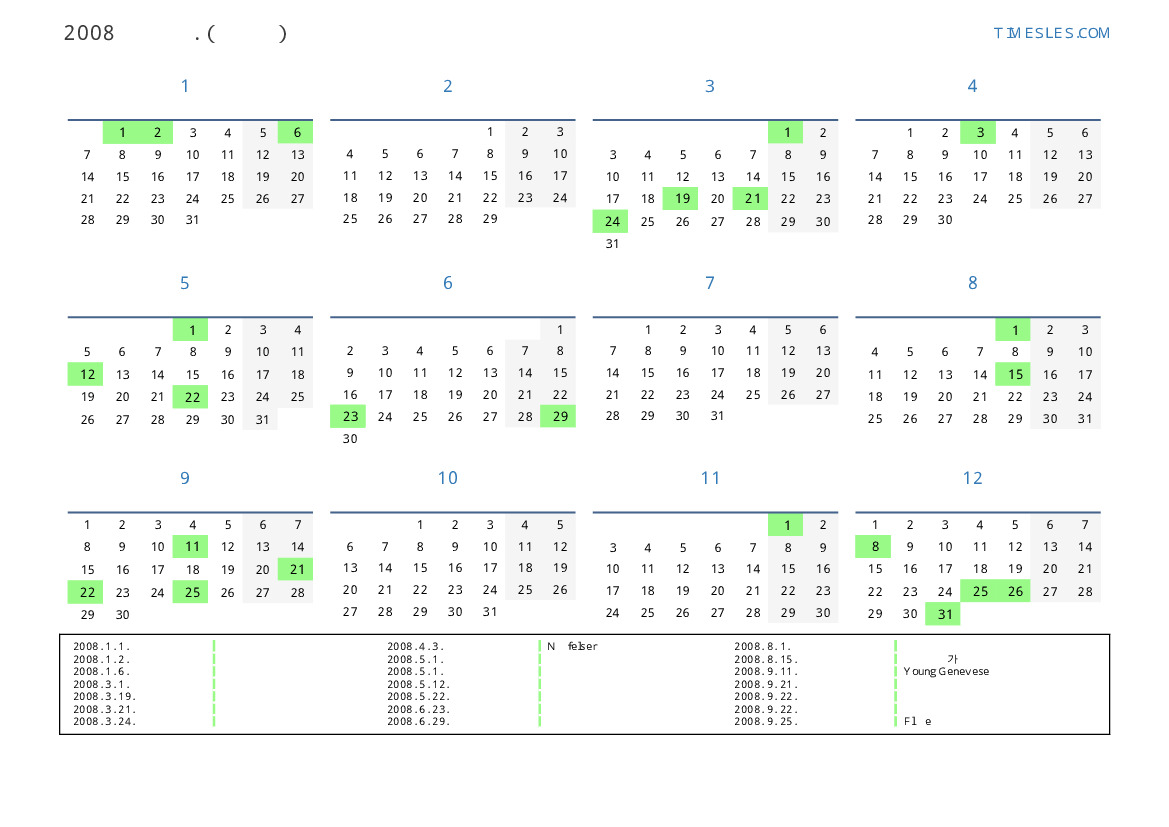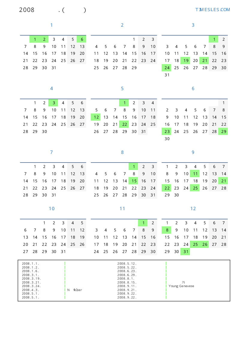 그레고리 안, 윤년, 1 년에 366 일. 2008년 스위스에서 40 공휴일 및 휴무 있습니다. 중국 동부 달력에서 2008 년은 쥐의 해입니다. 연도는 화요일에 시작하여 수요일에 끝납니다.