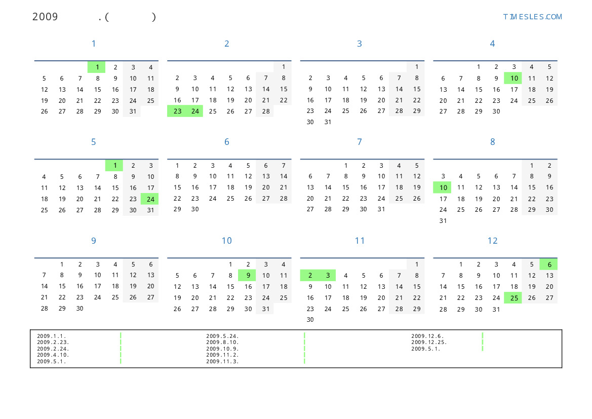 그레고리 안, 윤년이 아니다, 1 년에 365 일. 2009년 에콰도르 24 공휴일 및 휴무 있습니다. 중국 동부 달력에서 2009 년은 황소의 해입니다. 연도는 목요일에 시작하여 목요일에 끝납니다.