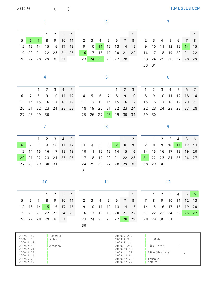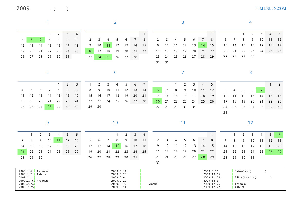 그레고리 안, 윤년이 아니다, 1 년에 365 일. 2009년 이란 22 공휴일 및 휴무 있습니다. 중국 동부 달력에서 2009 년은 황소의 해입니다. 연도는 목요일에 시작하여 목요일에 끝납니다.