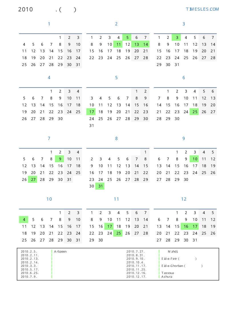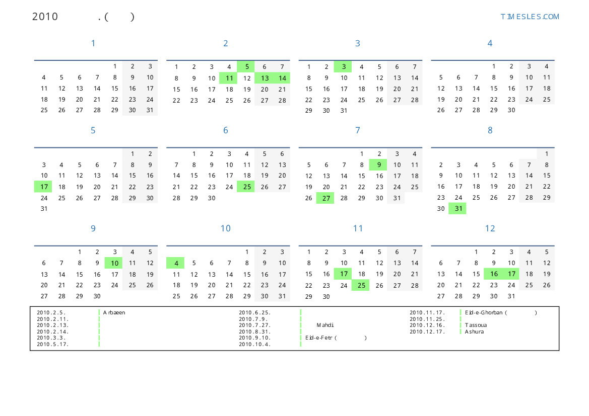 그레고리 안, 윤년이 아니다, 1 년에 365 일. 2010년 이란 20 공휴일 및 휴무 있습니다. 중국 동부 달력에서 2010 년은 호랑이의 해입니다. 연도는 금요일에 시작하여 금요일에 끝납니다.