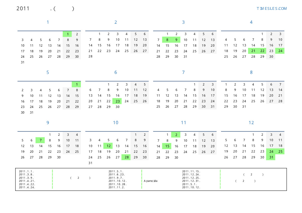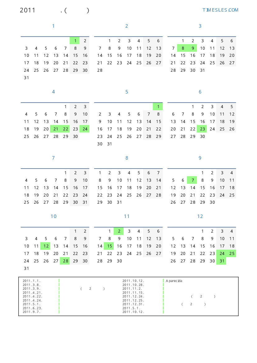 그레고리 안, 윤년이 아니다, 1 년에 365 일. 2011년 브라질에서 31 공휴일 및 휴무 있습니다. 중국 동부 달력에서 2011 년은 토끼의 해입니다. 연도는 토요일에 시작하여 토요일에 끝납니다.