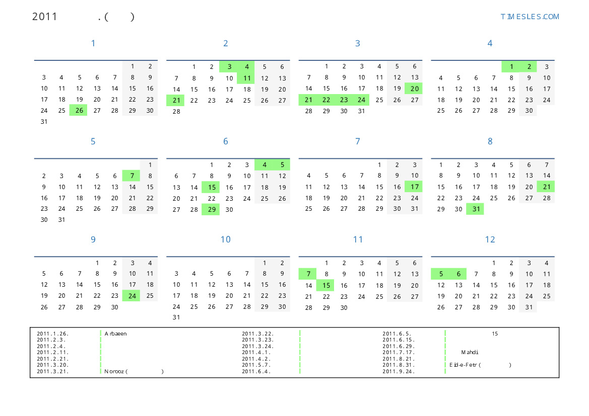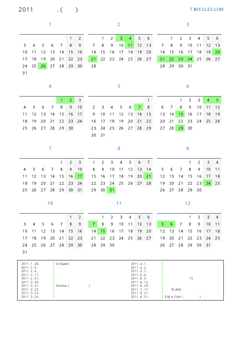 그레고리 안, 윤년이 아니다, 1 년에 365 일. 2011년 이란 29 공휴일 및 휴무 있습니다. 중국 동부 달력에서 2011 년은 토끼의 해입니다. 연도는 토요일에 시작하여 토요일에 끝납니다.