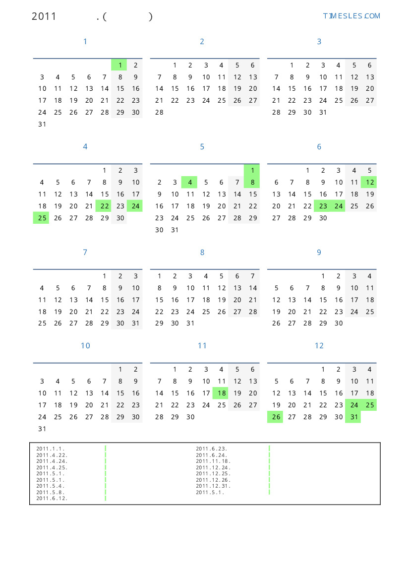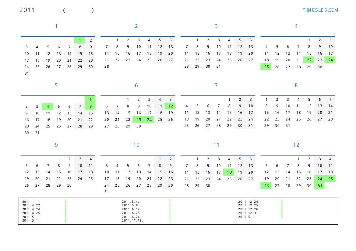 그레고리 안, 윤년이 아니다, 1 년에 365 일. 2011년 라트비아 27 공휴일 및 휴무 있습니다. 중국 동부 달력에서 2011 년은 토끼의 해입니다. 연도는 토요일에 시작하여 토요일에 끝납니다.