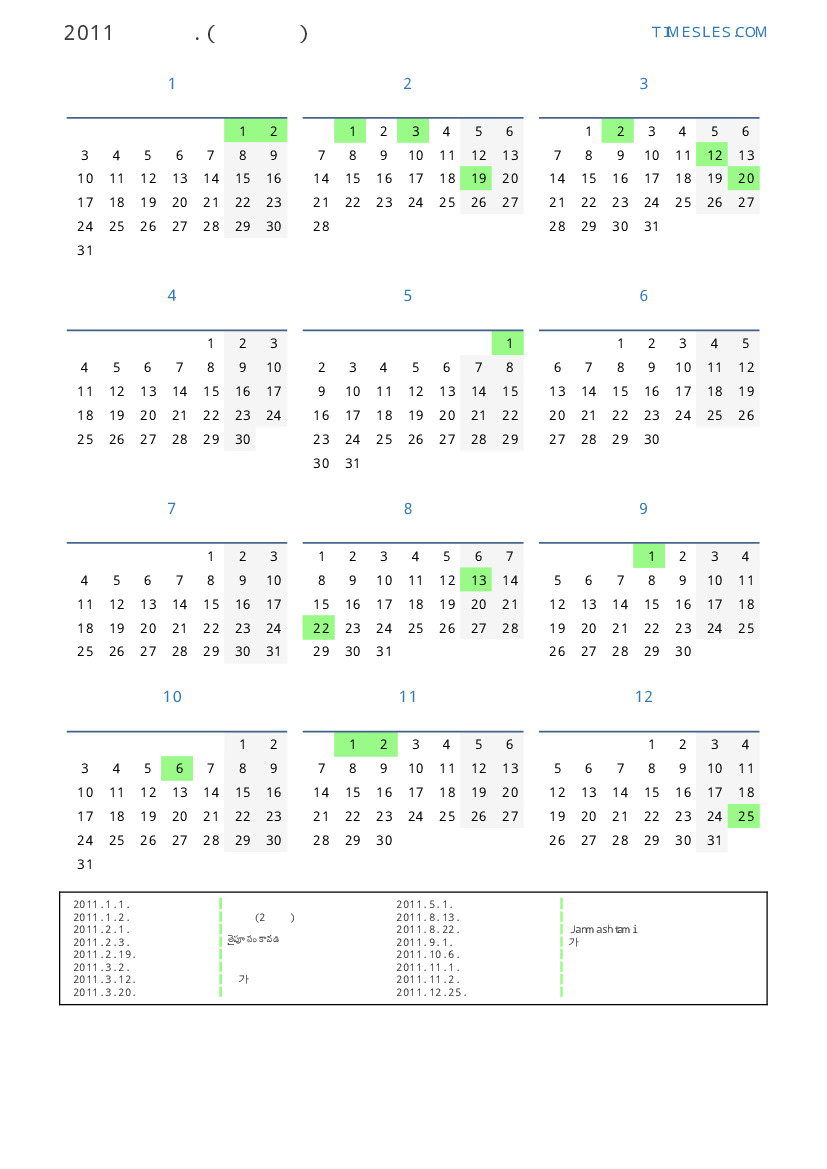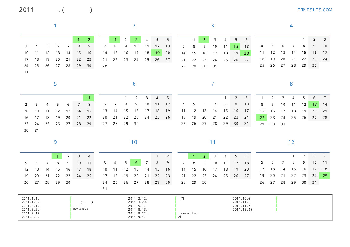 모리셔스 의 2011 년 공휴일 및 주말 달력