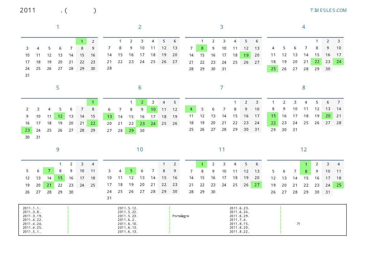 포르투갈 의 2011 년 공휴일 및 주말 달력