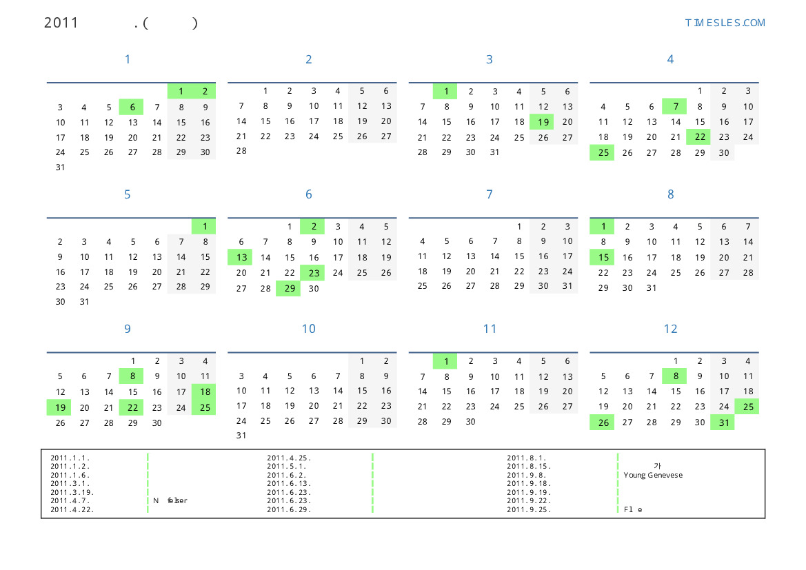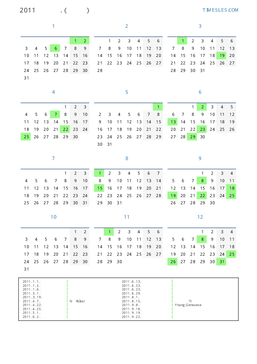 그레고리 안, 윤년이 아니다, 1 년에 365 일. 2011년 스위스에서 41 공휴일 및 휴무 있습니다. 중국 동부 달력에서 2011 년은 토끼의 해입니다. 연도는 토요일에 시작하여 토요일에 끝납니다.