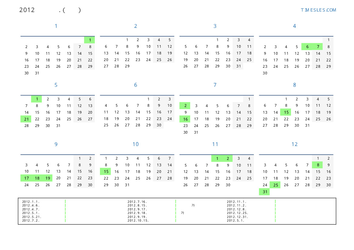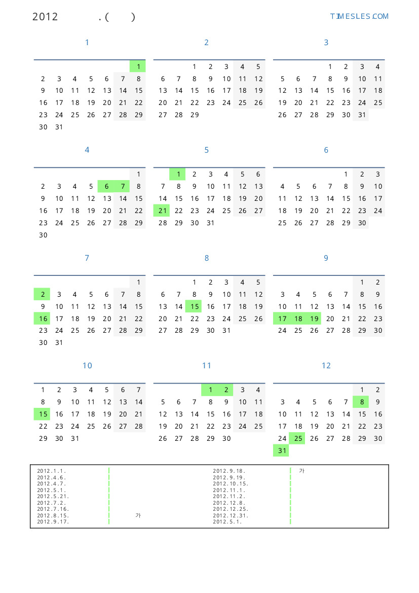 그레고리 안, 윤년, 1 년에 366 일. 2012년 칠레 25 공휴일 및 휴무 있습니다. 중국 동부 달력에서 2012 년은 용의 해입니다. 연도는 일요일에 시작하여 월요일에 끝납니다.