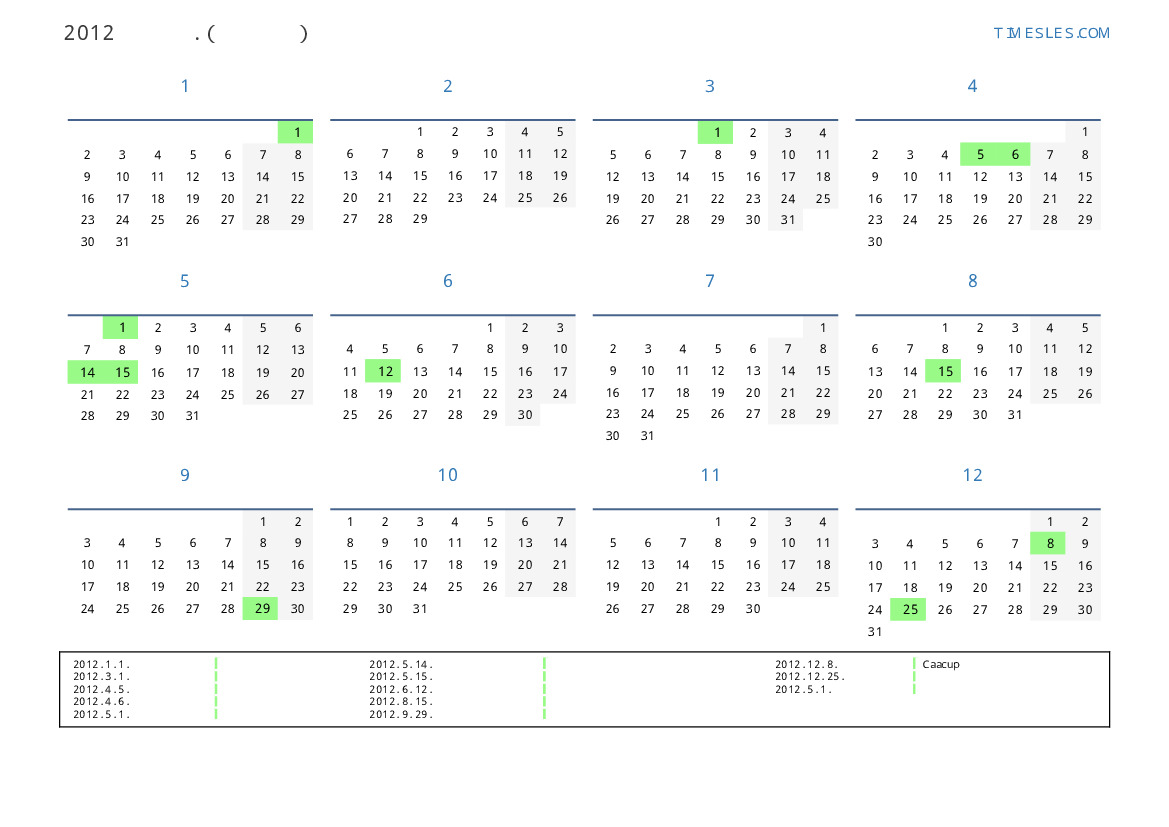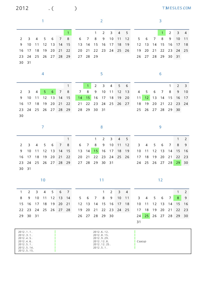 그레고리 안, 윤년, 1 년에 366 일. 2012년 파라과이 19 공휴일 및 휴무 있습니다. 중국 동부 달력에서 2012 년은 용의 해입니다. 연도는 일요일에 시작하여 월요일에 끝납니다.