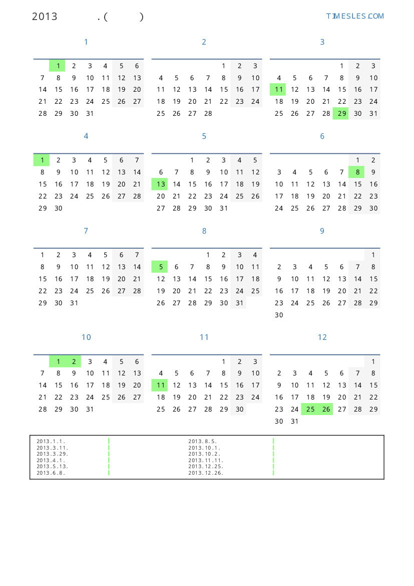 투발루 2013 년 공휴일 및 주말이 포함 된 PDF 캘린더 다운로드 및 인쇄