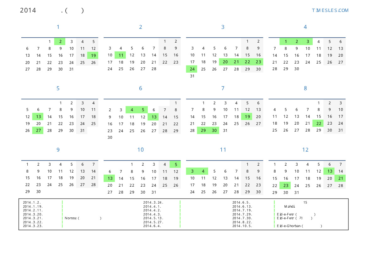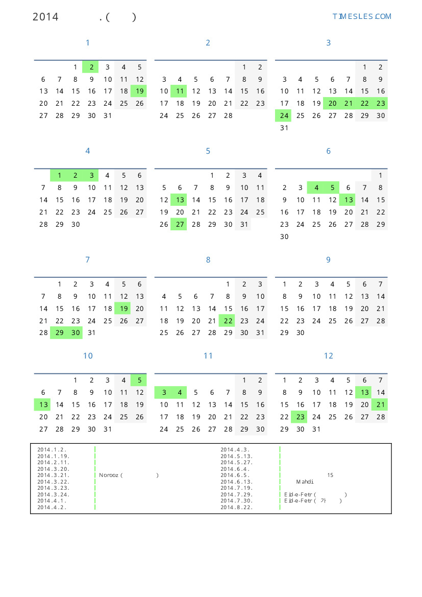 그레고리 안, 윤년이 아니다, 1 년에 365 일. 2014년 이란 31 공휴일 및 휴무 있습니다. 중국 동부 달력에서 2014 년은 말의 해입니다. 연도는 수요일에 시작하여 수요일에 끝납니다.