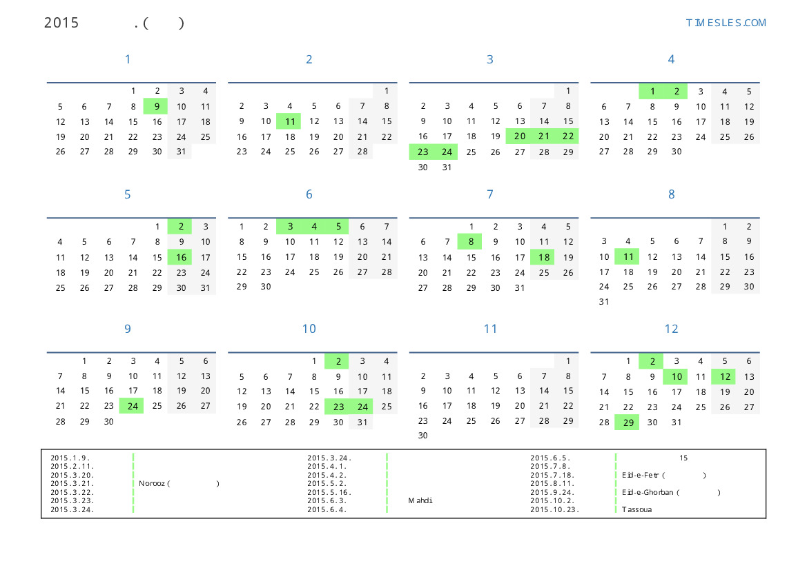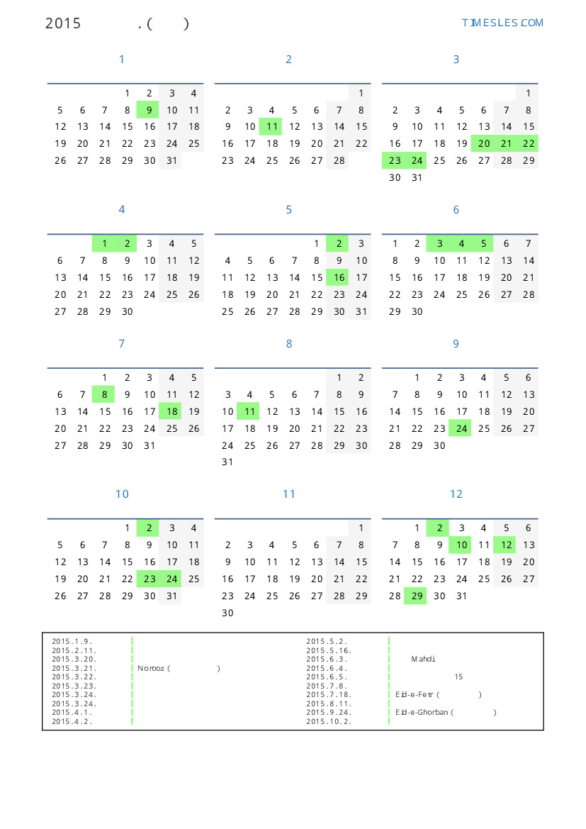 이란 의 2015 년 공휴일 및 주말 달력