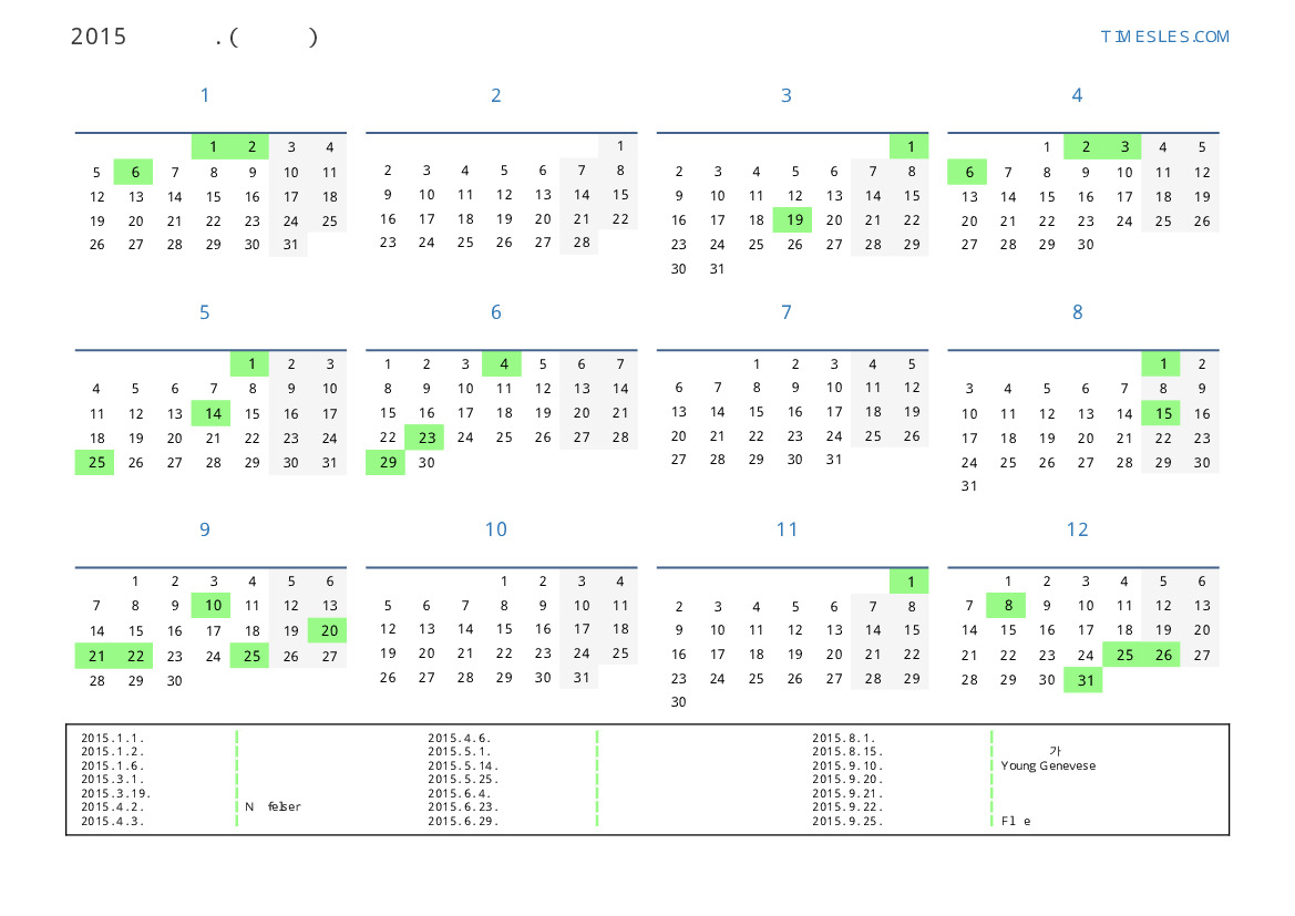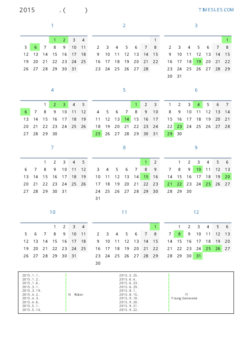그레고리 안, 윤년이 아니다, 1 년에 365 일. 2015년 스위스에서 41 공휴일 및 휴무 있습니다. 중국 동부 달력에서 2015 년은 양의 해입니다. 연도는 목요일에 시작하여 목요일에 끝납니다.