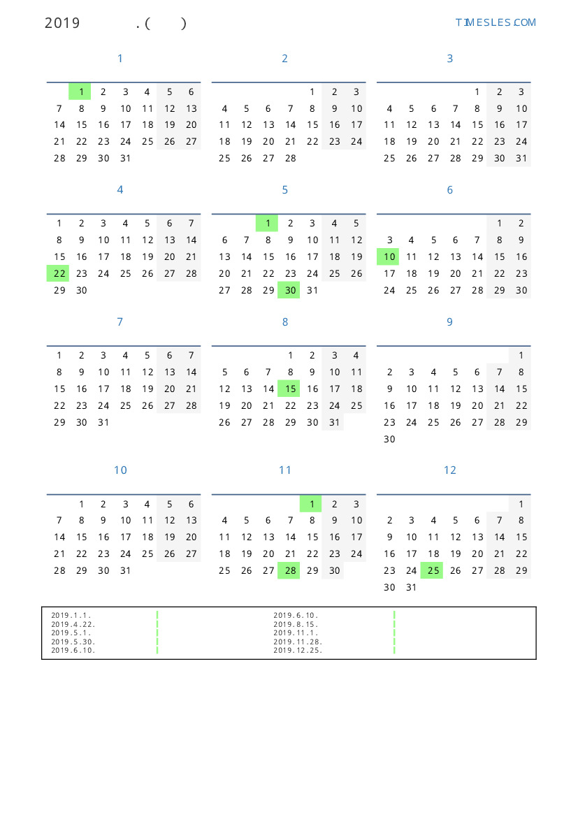 콩고 2019 년 공휴일 및 주말이 포함 된 PDF 캘린더 다운로드 및 인쇄