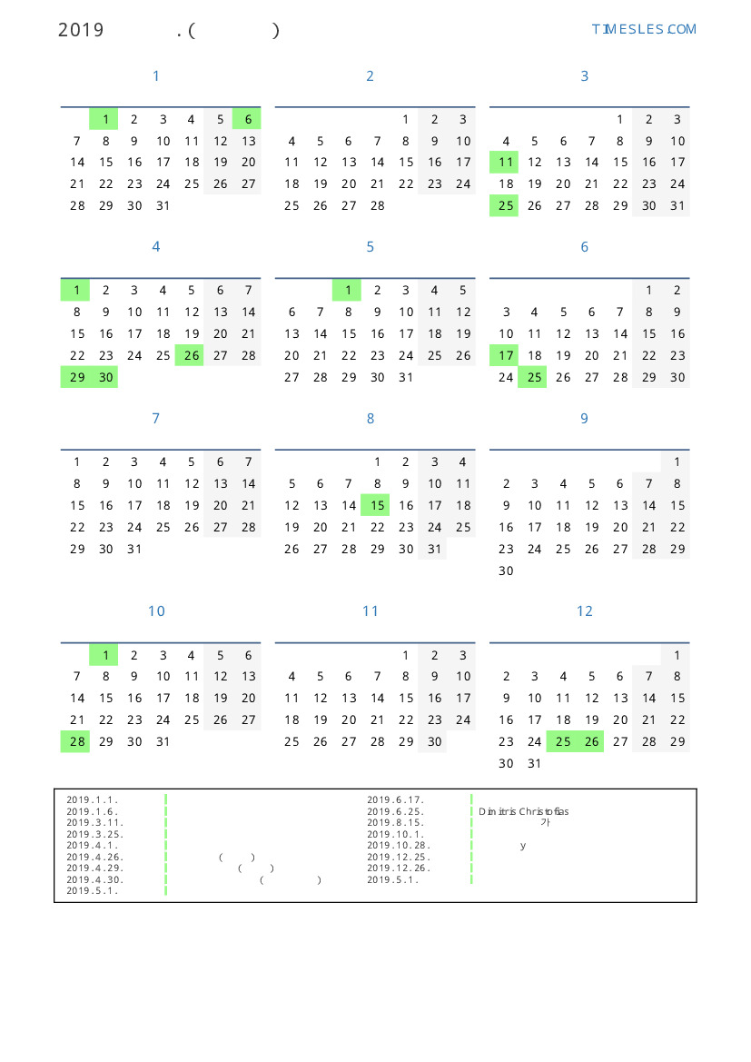 키프로스 2019 년 공휴일 및 주말이 포함 된 PDF 캘린더 다운로드 및 인쇄