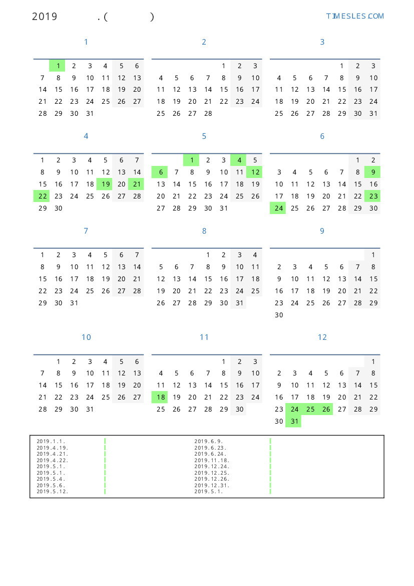 라트비아 2019 년 공휴일 및 주말이 포함 된 PDF 캘린더 다운로드 및 인쇄