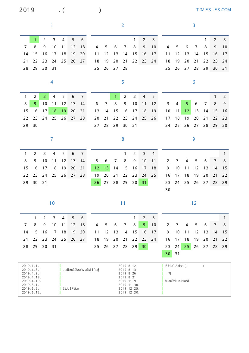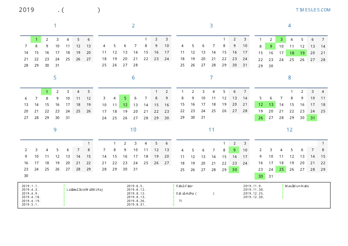 필리핀 2019 년 공휴일 및 주말이 포함 된 PDF 캘린더 다운로드 및 인쇄