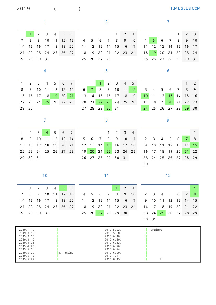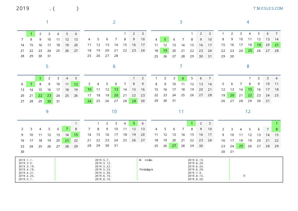 포르투갈 의 2019 년 공휴일 및 주말 달력