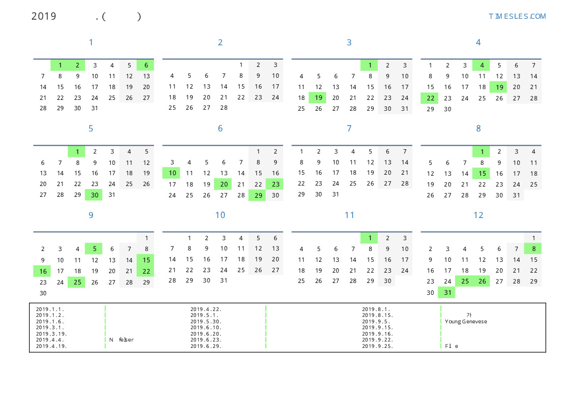 그레고리 안, 윤년이 아니다, 1 년에 365 일. 2019년 스위스에서 41 공휴일 및 휴무 있습니다. 중국 동부 달력에서 2019 년은 돼지의 해입니다. 연도는 화요일에 시작하여 화요일에 끝납니다.