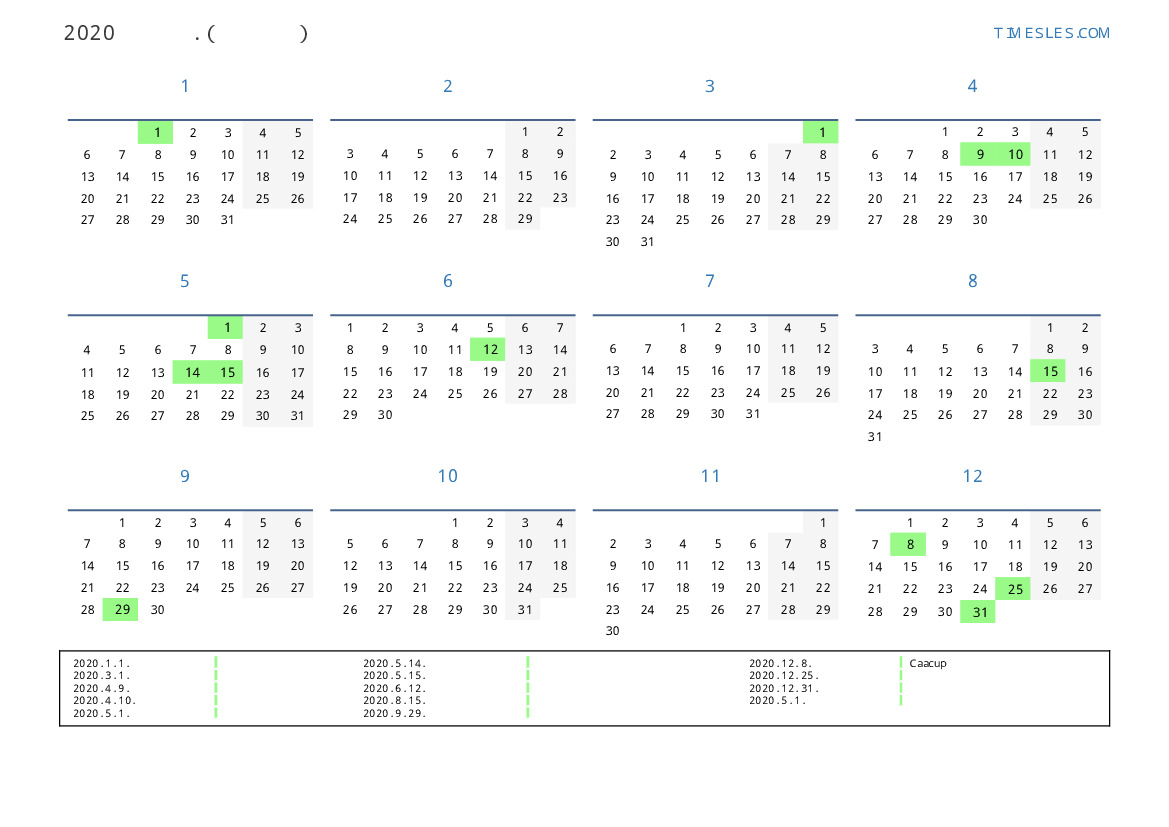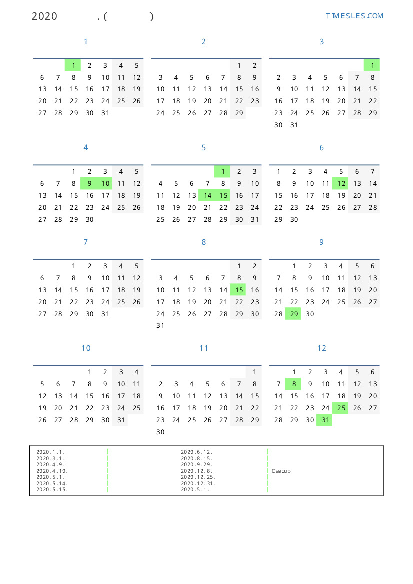 파라과이 2020 년 공휴일 및 주말이 포함 된 PDF 캘린더 다운로드 및 인쇄