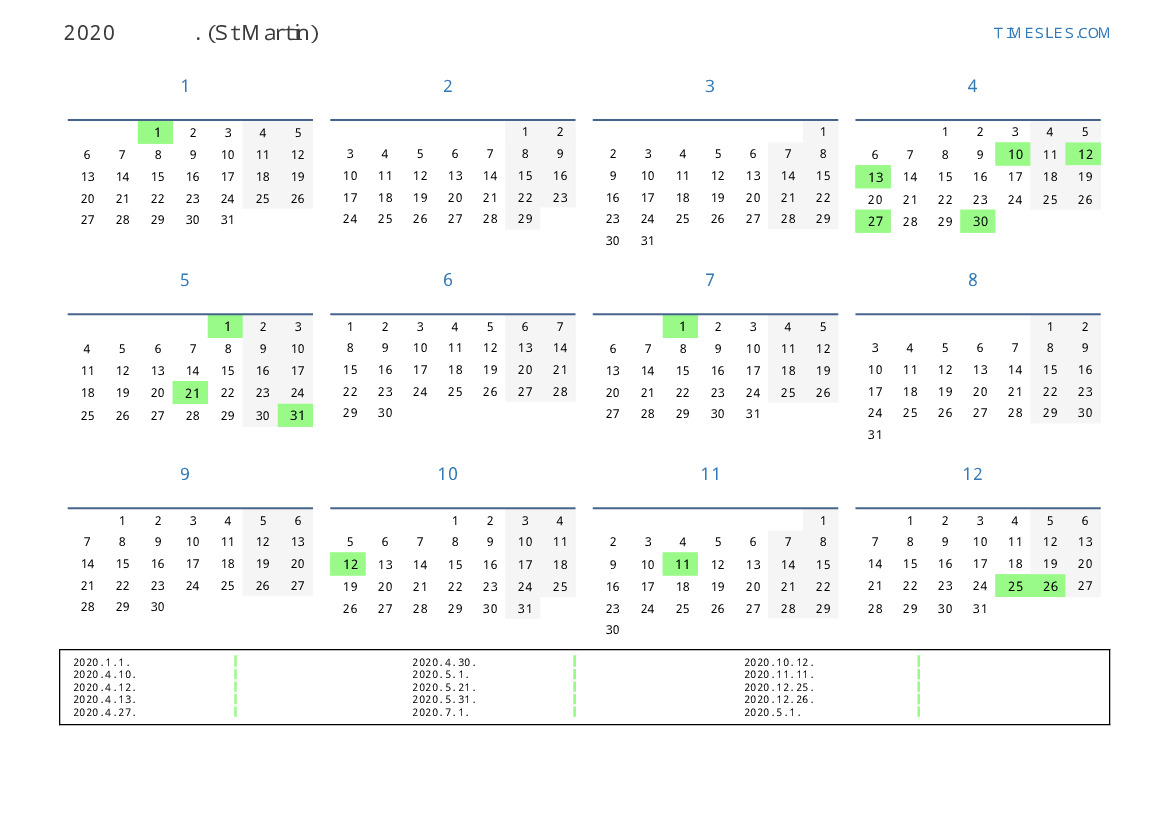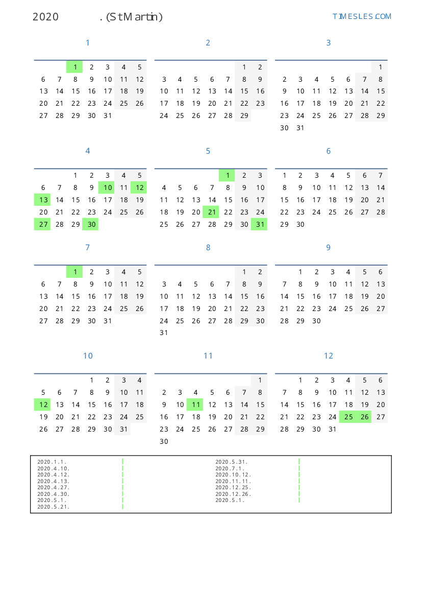 신트 마르 턴 2020 년 공휴일 및 주말이 포함 된 PDF 캘린더 다운로드 및 인쇄
