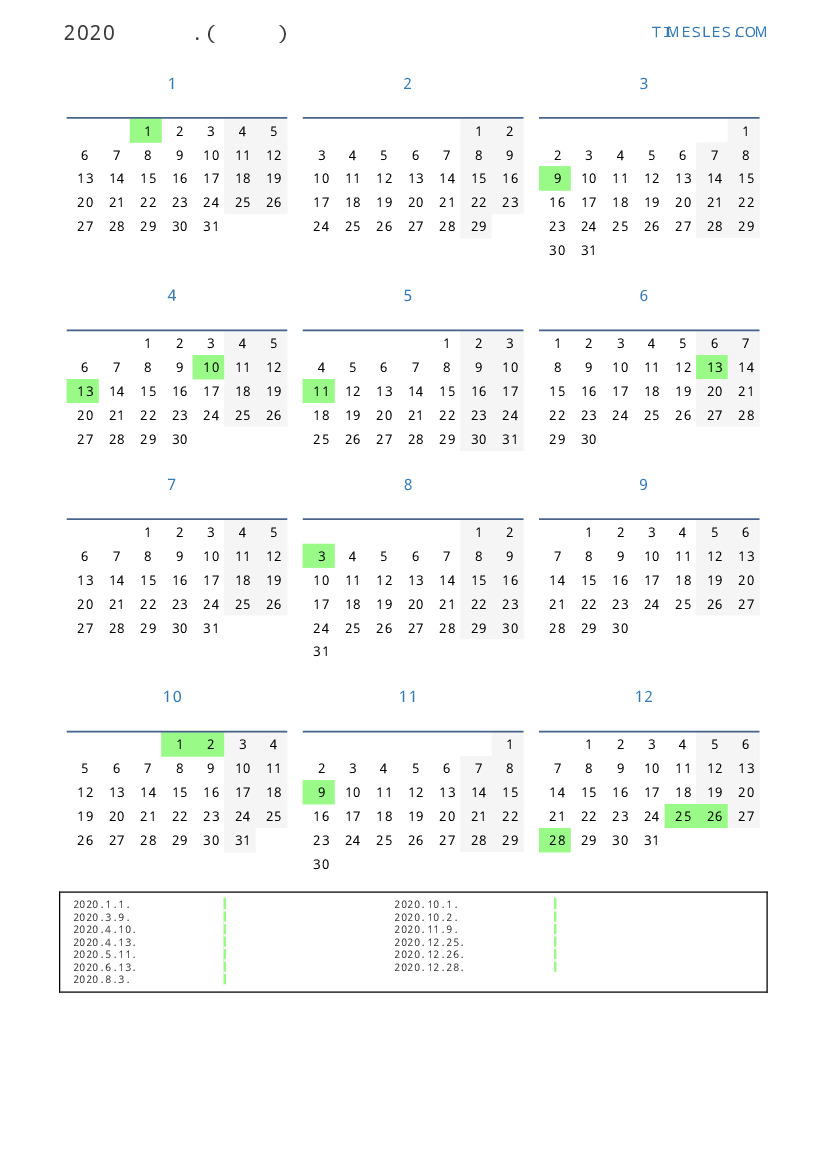 투발루 2020 년 공휴일 및 주말이 포함 된 PDF 캘린더 다운로드 및 인쇄