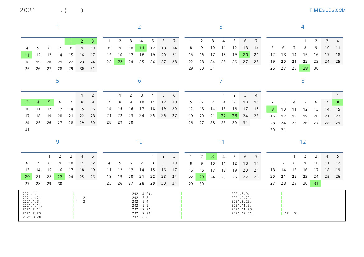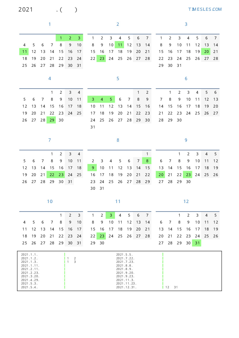 그레고리 안, 윤년이 아니다, 1 년에 365 일. 2021년 일본에서 32 공휴일 및 휴무 있습니다. 중국 동부 달력에서 2021 년은 황소의 해입니다. 연도는 금요일에 시작하여 금요일에 끝납니다.