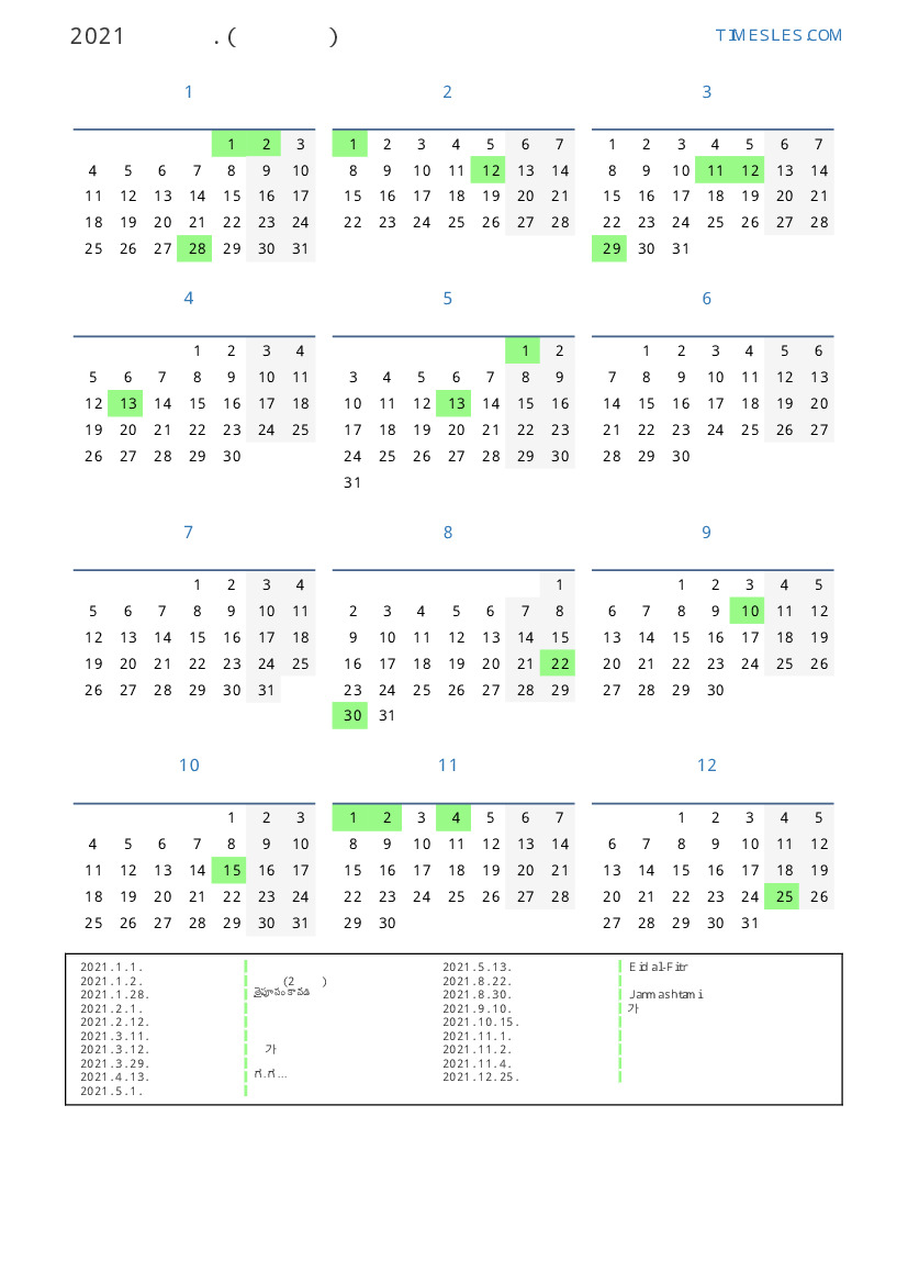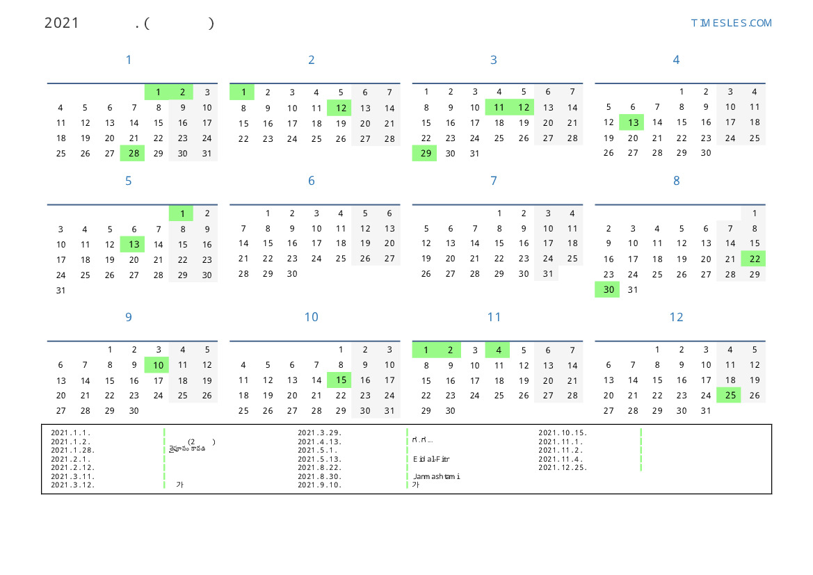 모리셔스 의 2021 년 공휴일 및 주말 달력