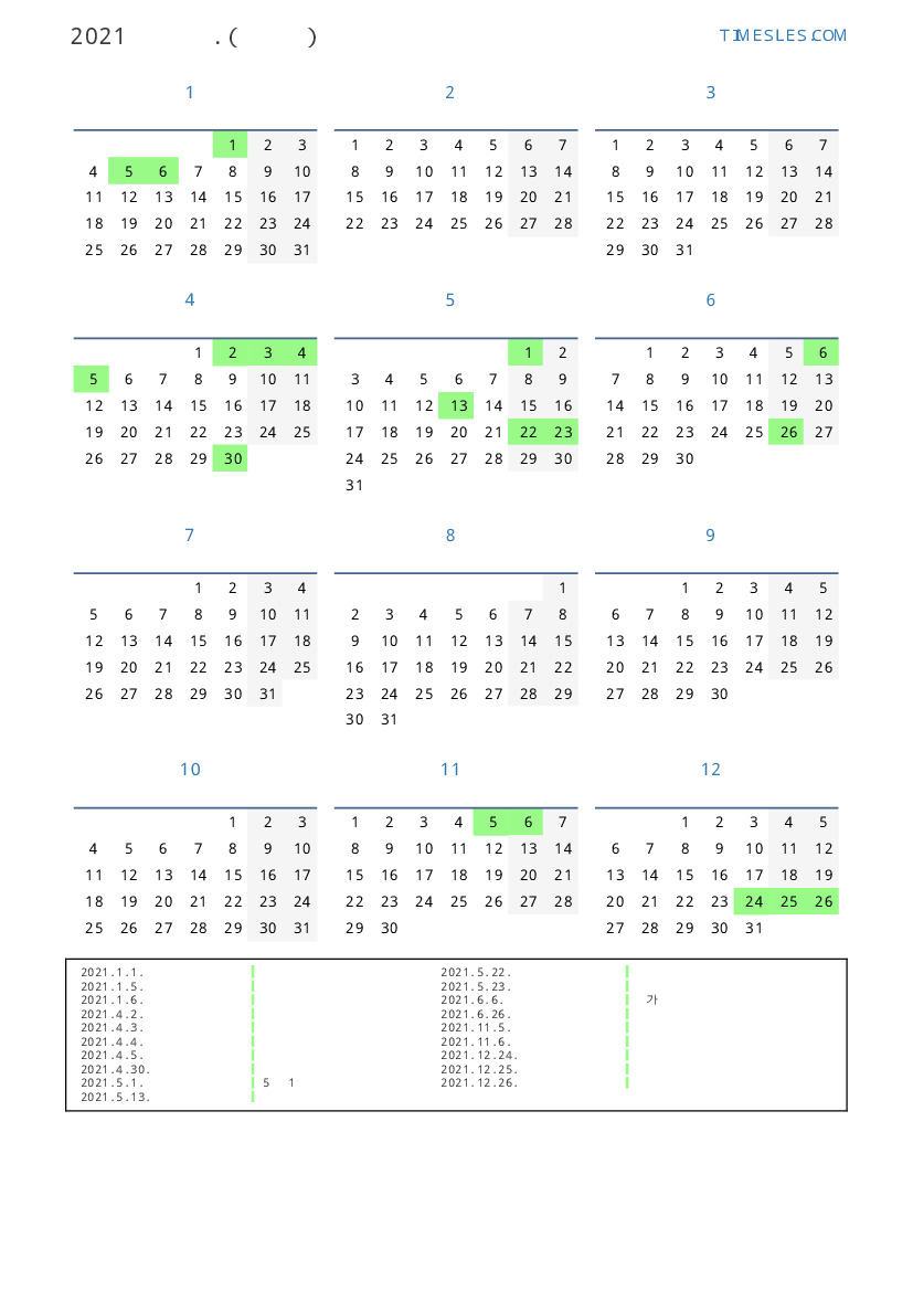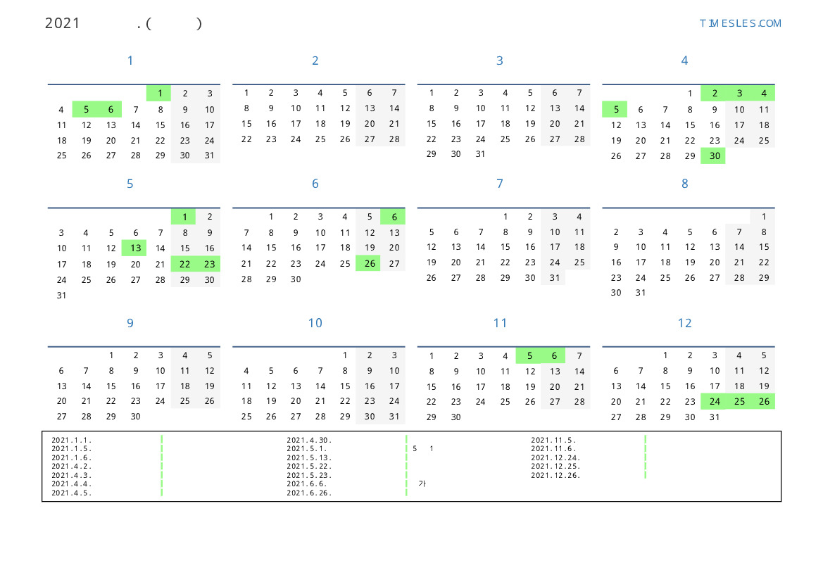 연휴가있는 계절별 세로 달력