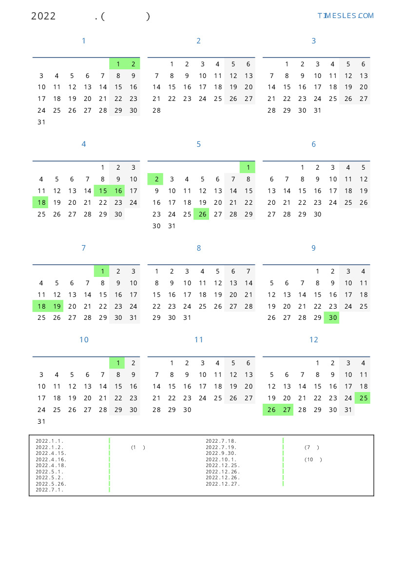 보츠와나 2022 년 공휴일 및 주말이 포함 된 PDF 캘린더 다운로드 및 인쇄