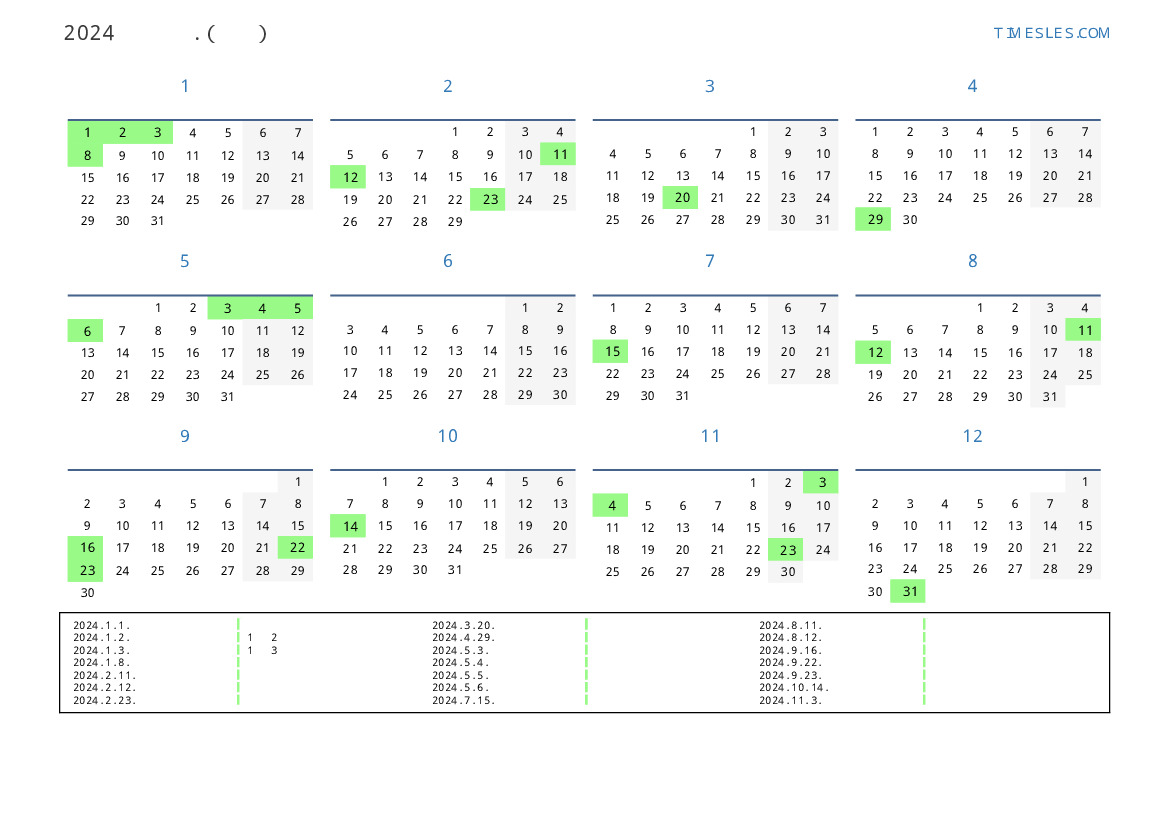그레고리 안, 윤년, 1 년에 366 일. 2024년 일본에서 36 공휴일 및 휴무 있습니다. 중국 동부 달력에서 2024 년은 용의 해입니다. 연도는 월요일에 시작하여 화요일에 끝납니다.
