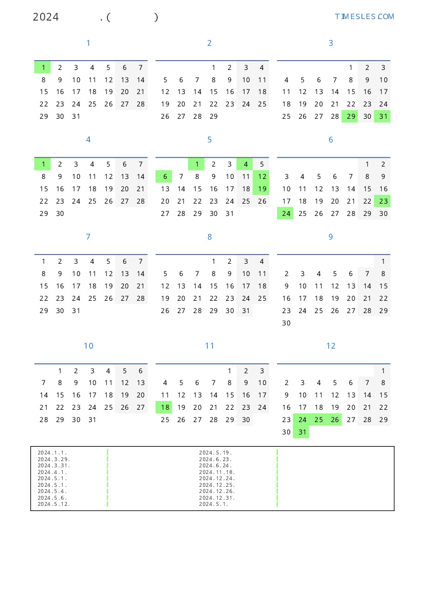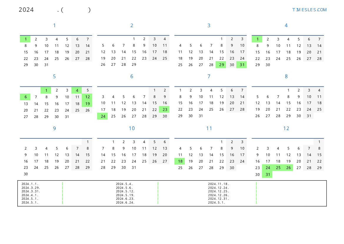 그레고리 안, 윤년, 1 년에 366 일. 2024년 라트비아 28 공휴일 및 휴무 있습니다. 중국 동부 달력에서 2024 년은 용의 해입니다. 연도는 월요일에 시작하여 화요일에 끝납니다.
