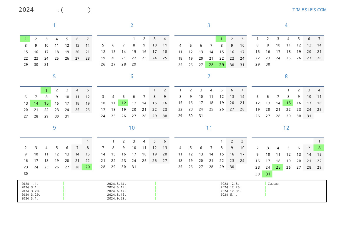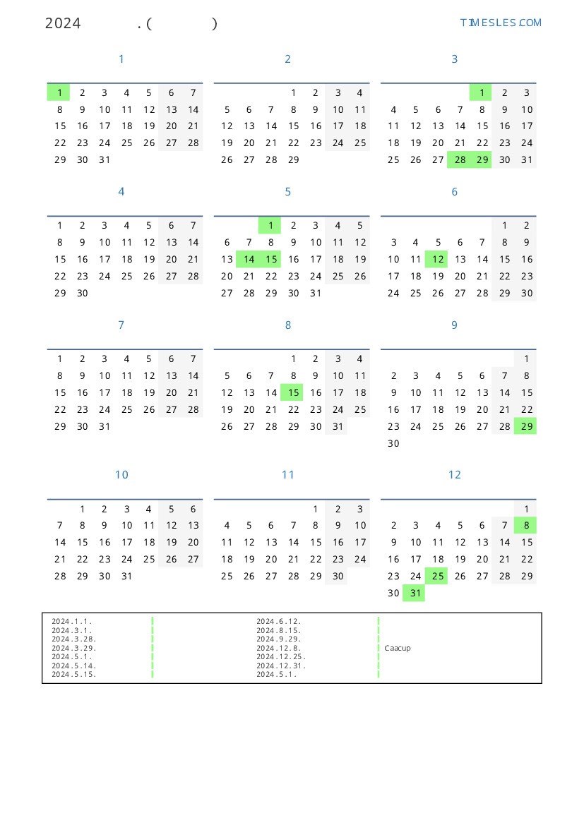 파라과이 2024 년 공휴일 및 주말이 포함 된 PDF 캘린더 다운로드 및 인쇄