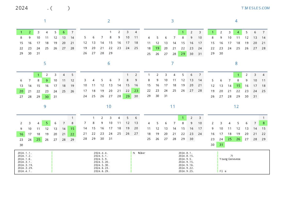스위스 2024 년 공휴일 및 주말이 포함 된 PDF 캘린더 다운로드 및 인쇄