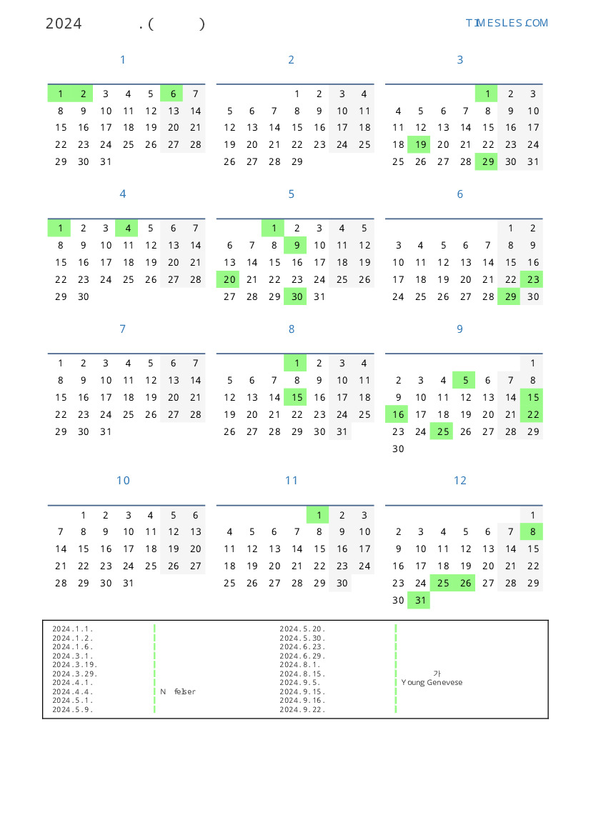 그레고리 안, 윤년, 1 년에 366 일. 2024년 스위스에서 41 공휴일 및 휴무 있습니다. 중국 동부 달력에서 2024 년은 용의 해입니다. 연도는 월요일에 시작하여 화요일에 끝납니다.