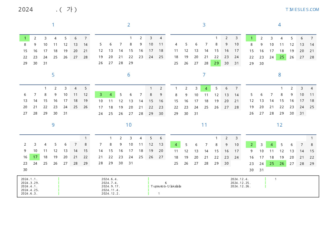 통가 2024 년 공휴일 및 주말이 포함 된 PDF 캘린더 다운로드 및 인쇄