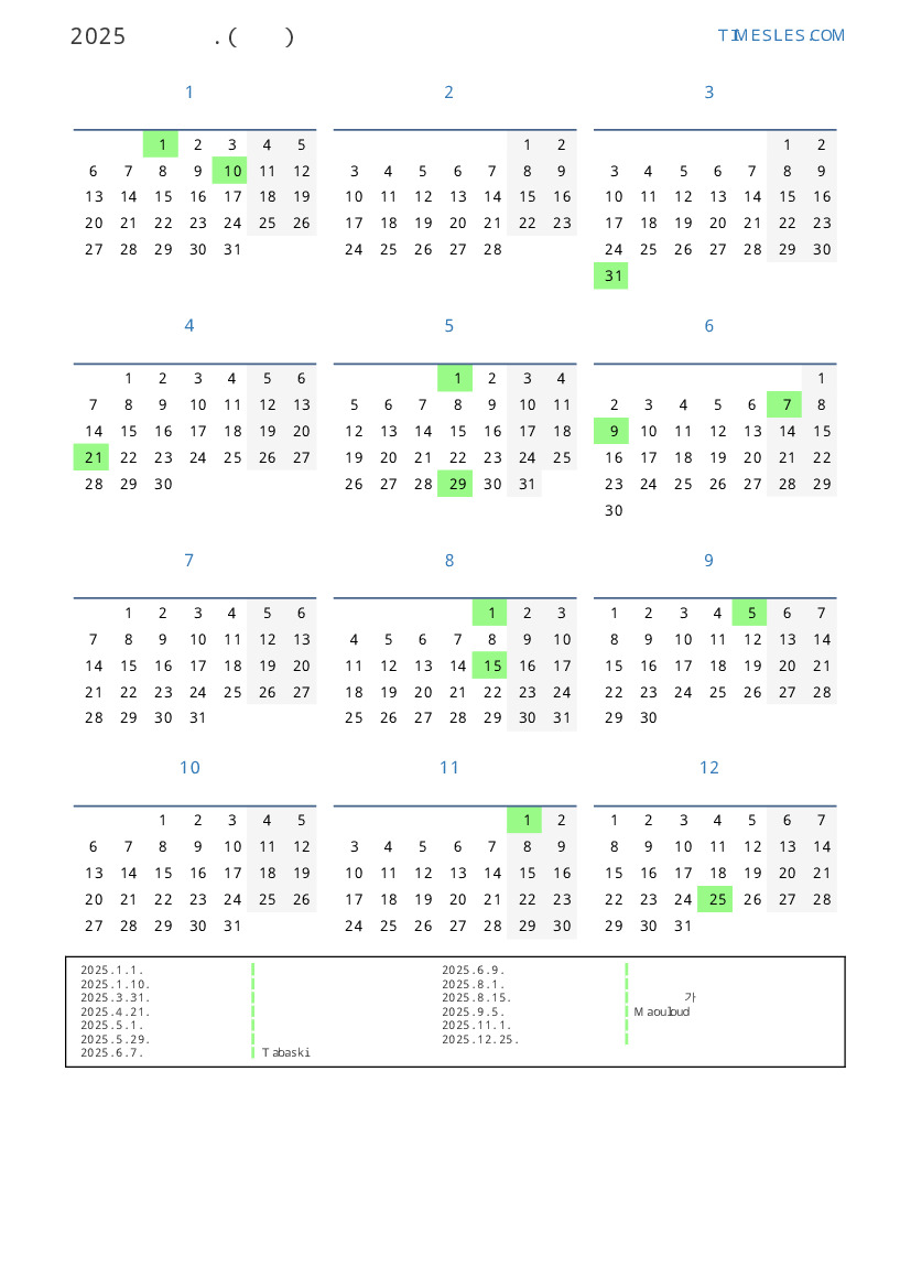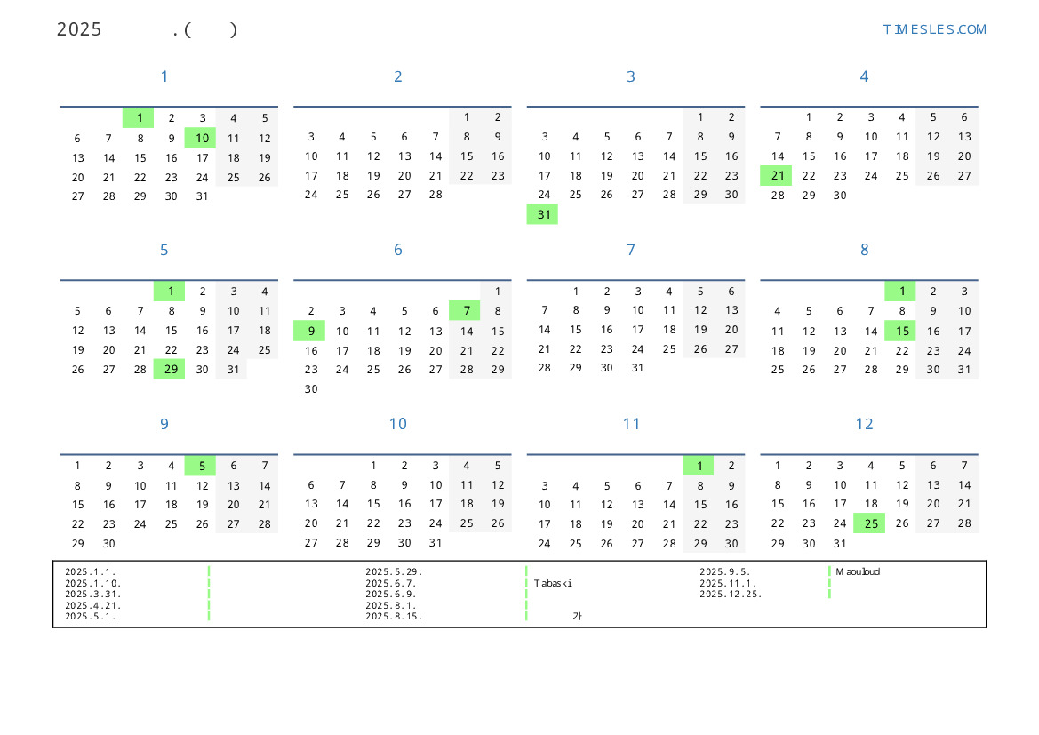 베냉 2025 년 공휴일 및 주말이 포함 된 PDF 캘린더 다운로드 및 인쇄