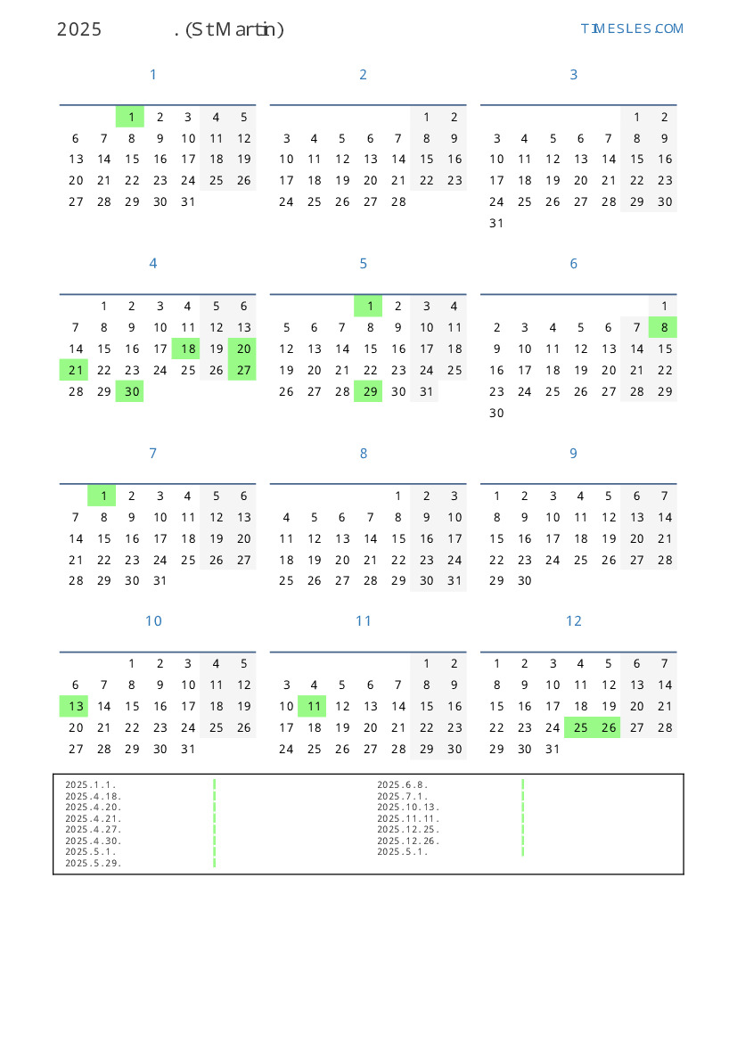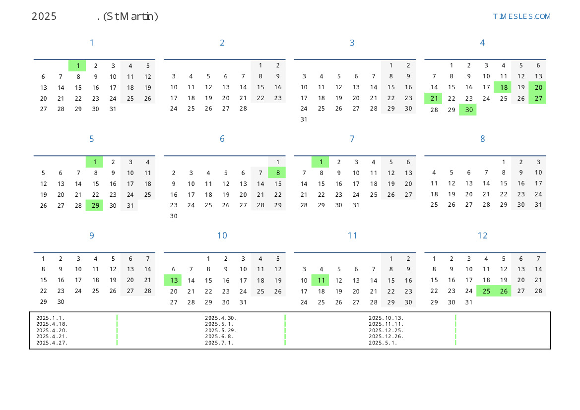 신트 마르 턴 2025 년 달력