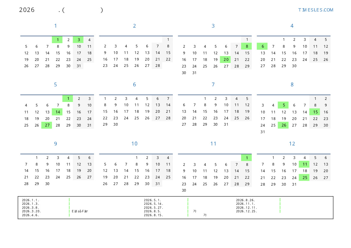 그레고리 안, 윤년이 아니다, 1 년에 365 일. 2026년 부르 키나 파소 18 공휴일 및 휴무 있습니다. 중국 동부 달력에서 2026 년은 말의 해입니다. 연도는 목요일에 시작하여 목요일에 끝납니다.