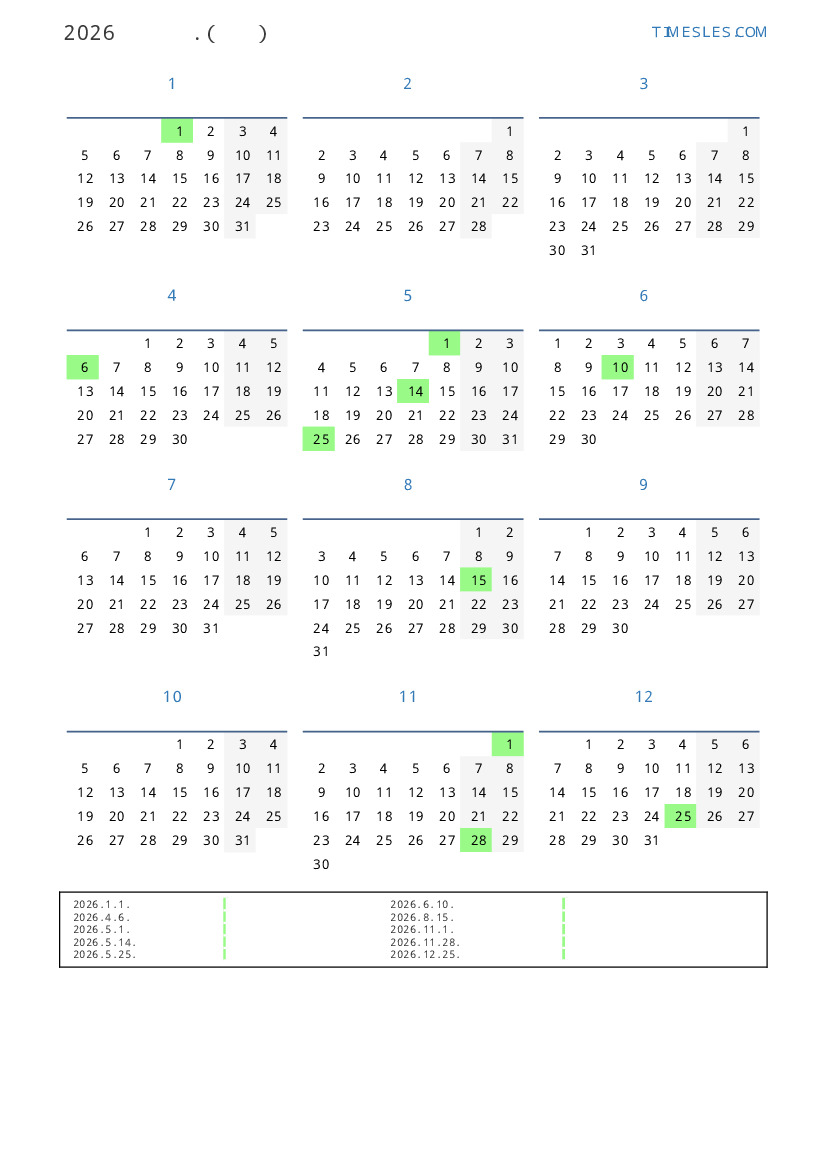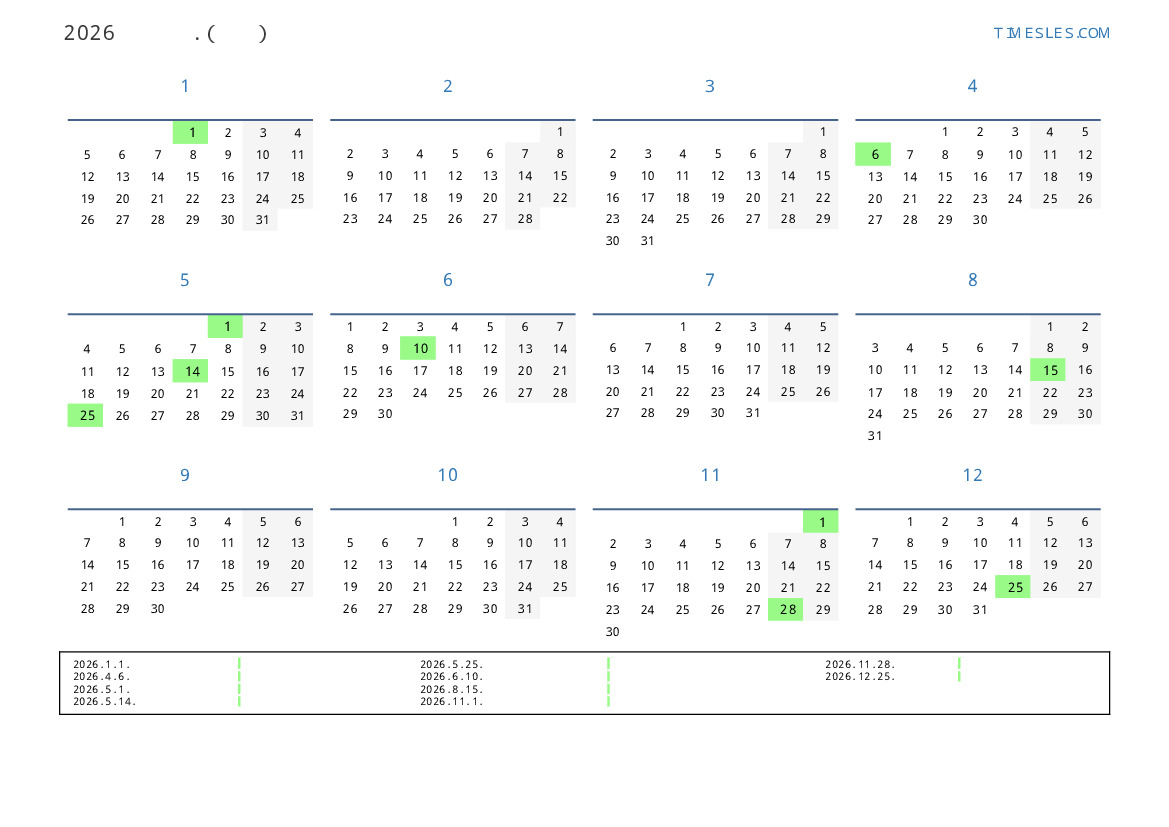 그레고리 안, 윤년이 아니다, 1 년에 365 일. 2026년 콩고 17 공휴일 및 휴무 있습니다. 중국 동부 달력에서 2026 년은 말의 해입니다. 연도는 목요일에 시작하여 목요일에 끝납니다.