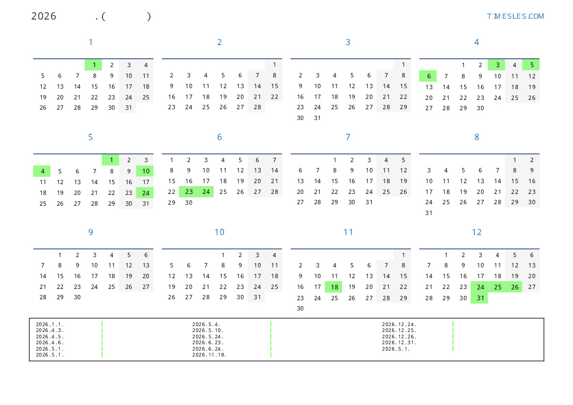 그레고리 안, 윤년이 아니다, 1 년에 365 일. 2026년 라트비아 27 공휴일 및 휴무 있습니다. 중국 동부 달력에서 2026 년은 말의 해입니다. 연도는 목요일에 시작하여 목요일에 끝납니다.