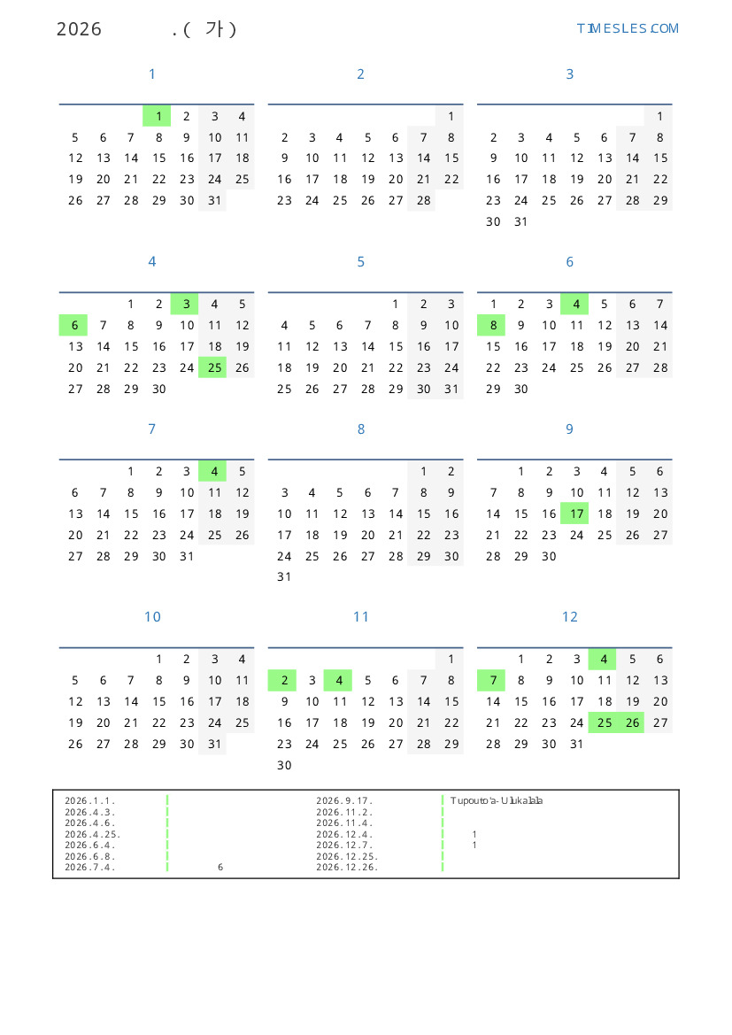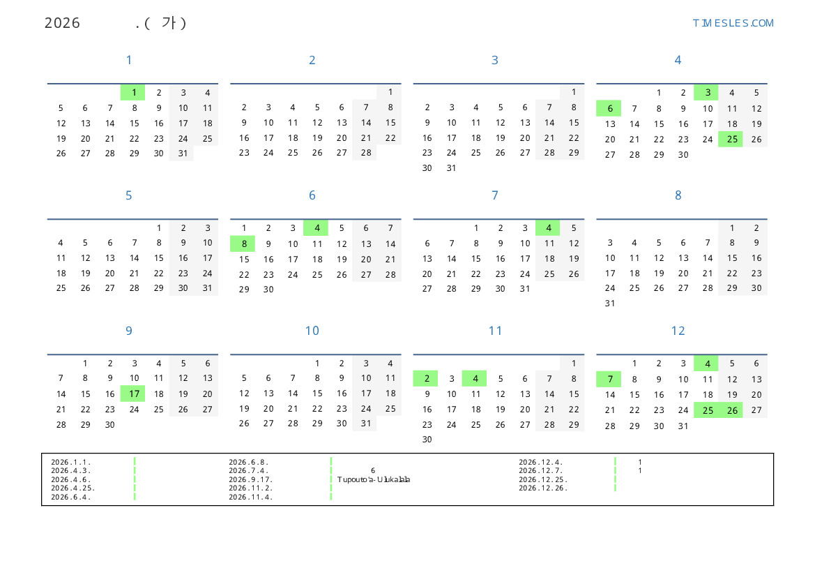 그레고리 안, 윤년이 아니다, 1 년에 365 일. 2026년 통가 18 공휴일 및 휴무 있습니다. 중국 동부 달력에서 2026 년은 말의 해입니다. 연도는 목요일에 시작하여 목요일에 끝납니다.