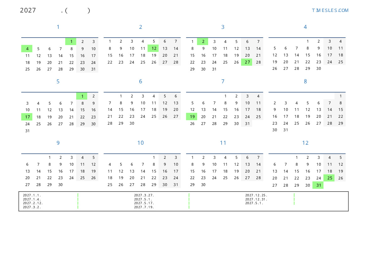 그레고리 안, 윤년이 아니다, 1 년에 365 일. 2027년 미얀마 15 공휴일 및 휴무 있습니다. 중국 동부 달력에서 2027 년은 양의 해입니다. 연도는 금요일에 시작하여 금요일에 끝납니다.